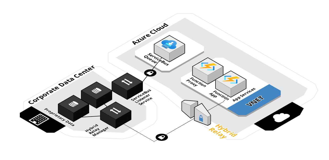 We run code inside an App Service or Function that interacts with our on-premises servers. Some considerations of this model: